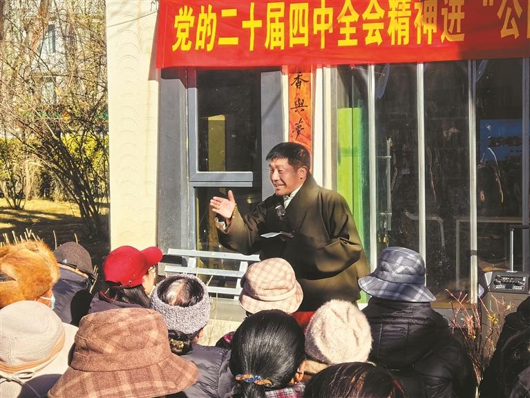 宗角禄康公园一角,宣讲员向群众宣讲党的二十届四中全会精神。