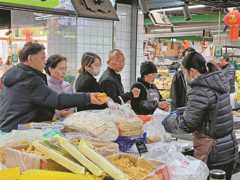◀市民群众在拉萨市贡布堂综合农贸市场购买蔬菜。