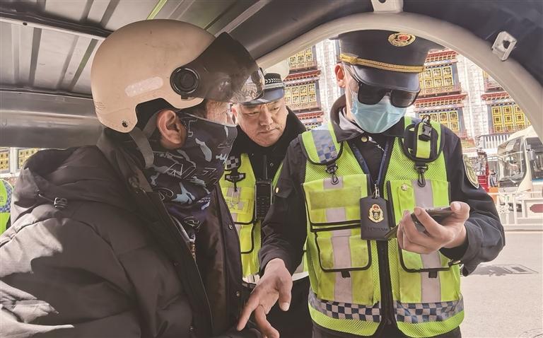 “您好,请出示驾驶证和行驶证。”“谢谢配合,注意骑行安全。”4月2日16时许,记者来到北京东路路段,此时道路上人车流量较大,交通十分繁忙,由拉萨市交通运输综合行政执法队、拉萨市公安局交通管理支队、拉萨市公安局旅游警察支队组成的联合执法队,各部门执法人员分工协作、密切配合,在路段设置临时检查点,对过往的电动三轮车进行逐一检查。